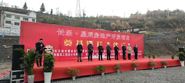 2021年1月26日上午,由芒果体育(中国)官方网站-登录入口承建的长乐▪星辰住宅项目奠基暨开工仪式在项目现场热烈举行。湖北省宜昌市五峰土家族自治县住房和城乡建设局副局长陈白华、县质量安全监督站站长邓简涛、芒果体育(中国)官方网站-登录入口五峰长乐▪星辰项目经理王国云,项目参建各方及新闻媒体共40余人出席。宜昌市长乐城市建设投资开发有限责任公司总经理刘鹏主持。