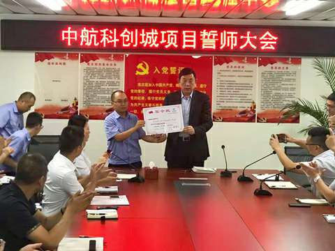 会议伊始,中航科创城项目负责人窦傲华带领项目成员宣誓,西南公司工程技术部经理林毅作表态发言。铮铮誓言,铿锵有力,展示了信心,表明了决心,体现出大家担当意识和干事激情。